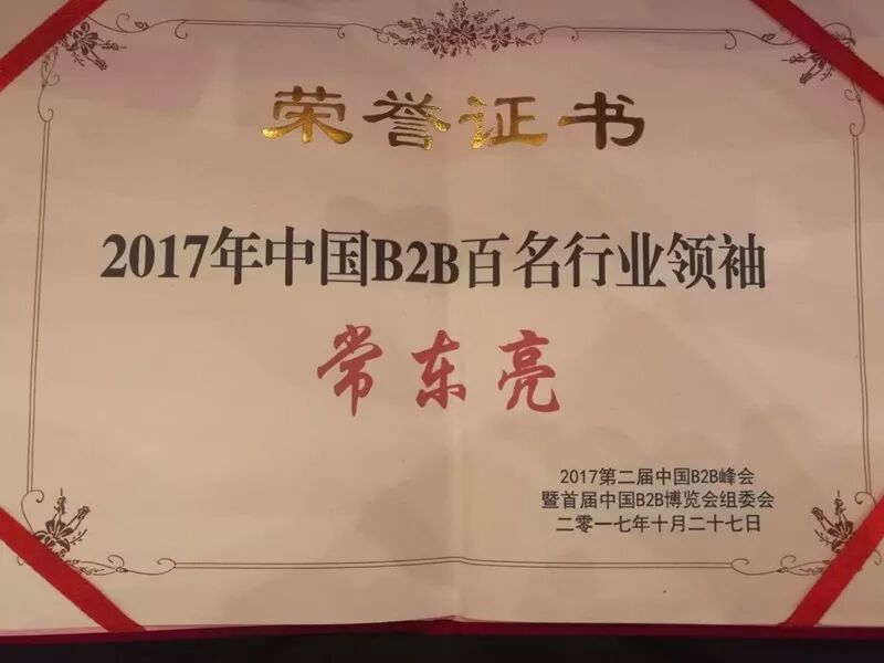 ▲ 2017年中国B2B百名行业领袖荣誉证书